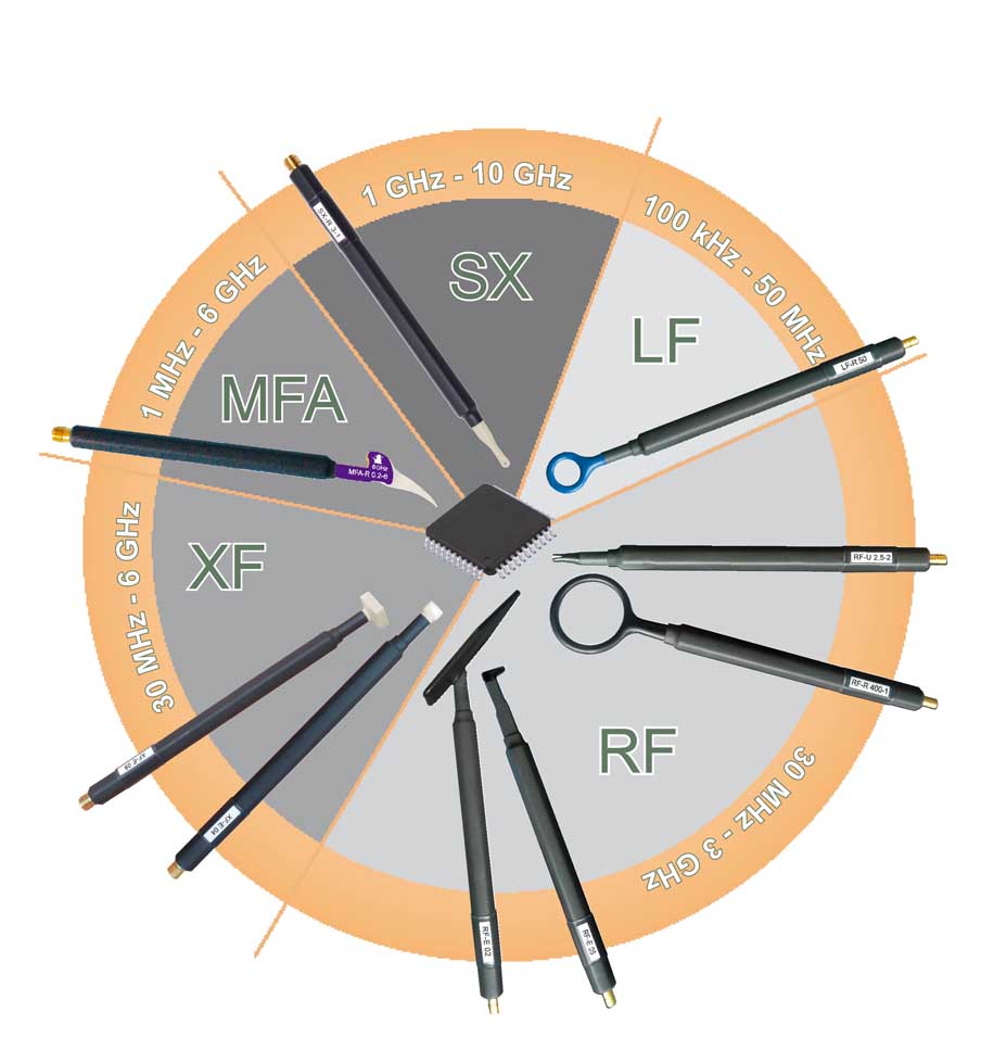 四、近場測試起點:近場分析的初衷是要得到一個理想的磁場分布,這非常必要。 RF-R400、RF-R3、RF-R0.3、RF-R50和MFA-R0.2 磁場探頭特別適合這個應用。近場測試使其成為可能: