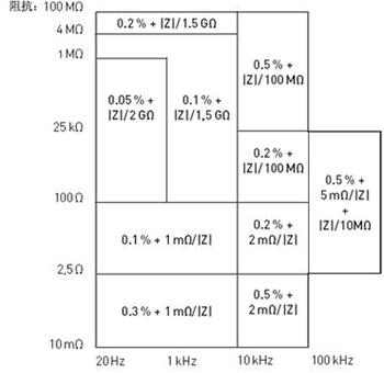 例1:測量10pF 電容,其在1kHz 時阻抗為15MΩ 。在這種情況下精確度表中,第一行是有效的: