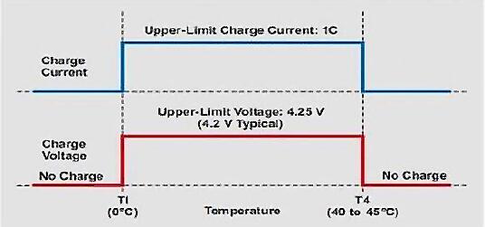 在標準充電溫度范圍(T2到T3)內,使用者可在電池制造廠商建議的上限充電電壓和上限充電電流最佳狀態下,安全地對鋰電池充電。