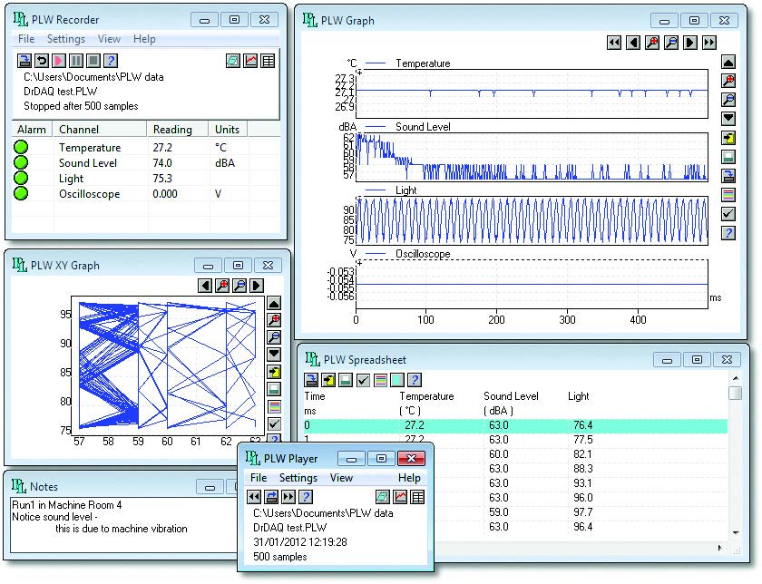 PicoLog可同時(shí)從最多20個(gè)變送器采集數(shù)據(jù)。這不只是允許把多個(gè)電壓輸入儀器混合用于同一臺(tái)電腦,也允許同時(shí)使用其它基于電腦的儀器例如TC-08熱電偶數(shù)據(jù)記錄儀。