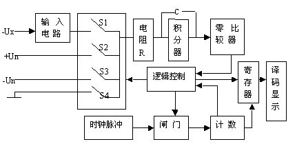 數字直流電壓表A/D轉換器將隨時間連續變化的模擬電壓量變換成數字量,再由電子計數器對數字量進行計數得到測量結果,再由譯碼顯示電路將測量結果顯示出來。邏輯控制電路控制電路的協調工作,在時鐘的作用下按順序完成整個測量過程。根據采用的A/D轉換方式可分為積分式和非積分式,現以雙斜積分式為例介紹直流電壓表的工作原理。