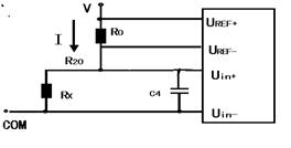 電阻——電壓轉換電路如圖1.6所示。圖中I。為直流電壓表內部的測試電流,流經Rx,Rx兩端就會產生正比于被測電阻Rx的電壓降,由直流電壓表測出這個壓降就得到被測電阻Rx的值,Rx=U/I。
